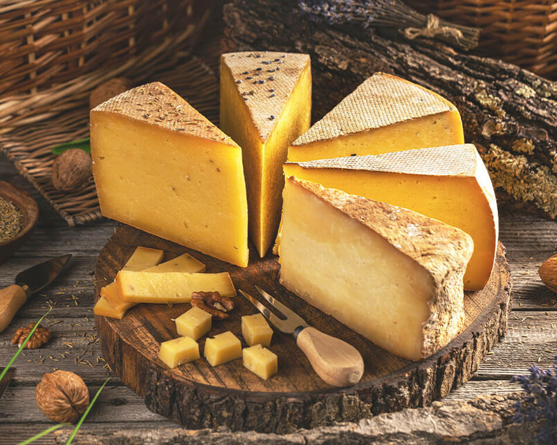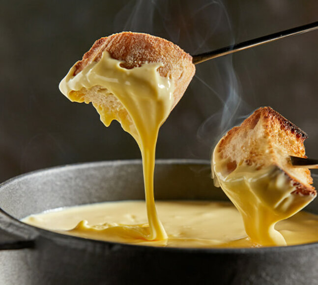 Das Fundament unserer Fondues ist ein Hartkäse von einem Produzenten ganz in der Nähe. Durch seine harte Struktur verbindet er die anderen verwendeten Käsesorten miteinander. Der Hartkäse gibt dem Ganzen ein Gerüst. Zu diesem Gerüst können Aromen und fetterer, magerer, älterer oder jüngerer Käse dazugegeben werden. Apropos jüngerer Käse: Dieser zieht zwar längere Fäden, hat aber weder Aromatik noch Charakter oder Körper. Der ältere Käse hat dafür deutlich mehr Aroma, durch die längere Reifezeit aber auch mehr Aufwand und ist entsprechend teurer. Bei Eberle verwenden wir nur älteren Käse.