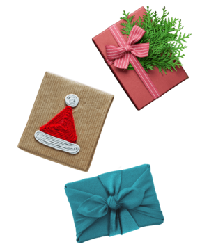 Geschenke ohne Papier einpacken? Das funktioniert grossartig mit Stoffresten aus Jute, Baumwolle, Seide oder aus Kunstfasern. Grundsätzlich sind feste, nicht dehnbare Stoffe empfehlenswert, die sich gut falten und fixieren lassen. Oder Sie verwenden ein Furoshiki, ein traditionelles japanisches Stofftuch, mit dem Geschenke verpackt werden. Zur Befestigung dienen ein schönes Band, Stecknadeln oder Knoten. Diese Art der Verpackung macht Ihr Geschenk zu etwas Besonderem und ist nachhaltig, denn der Geschenkstoff kann immer wieder verwendet werden.